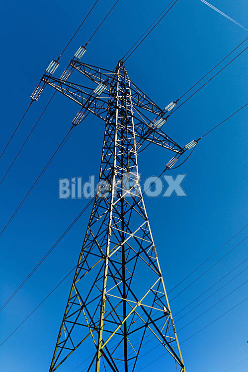 Beschreibung Hochspannungsmast, Symbolfoto für Stromproduktion, Versorgung und Stromnetz