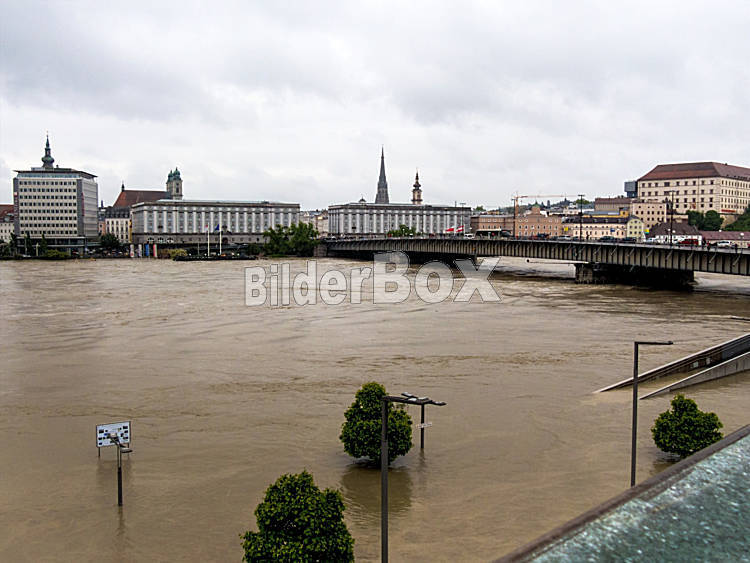 Beschreibung Hochwasser 2013. Linz, Österreich. Überflutung und Überschwemmung