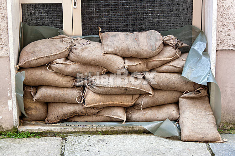 Beschreibung Hochwasser in Passau. Bayern. Deutschland. Sandsäcke schützen gegen das Wasser