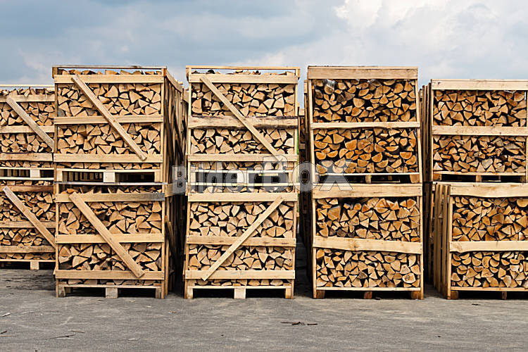 Beschreibung Ein grosser Holz Stapel für Brennholz auf einem Lagerplatz