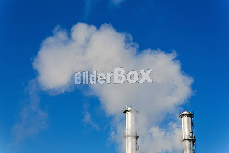 Beschreibung Schlot eines Industriebetriebes mikt Rauch. Symbolfoto für Umweltschutz und Ozon.