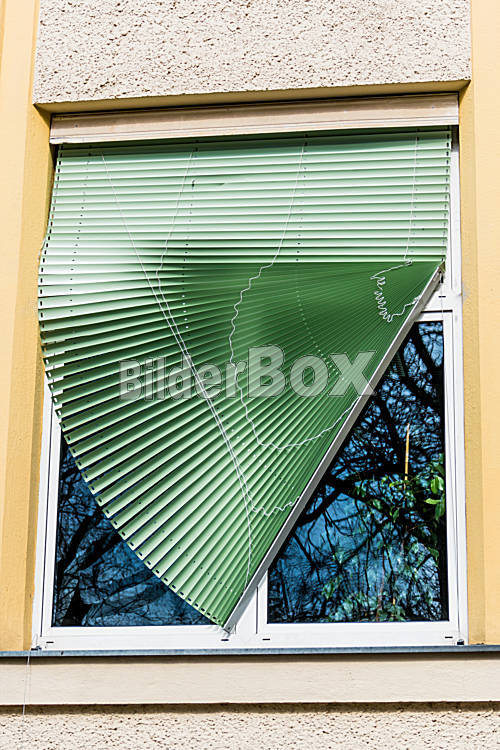 Beschreibung Kaputte Jalousie vor einem Fenster an einer Schule in Linz, Österreich