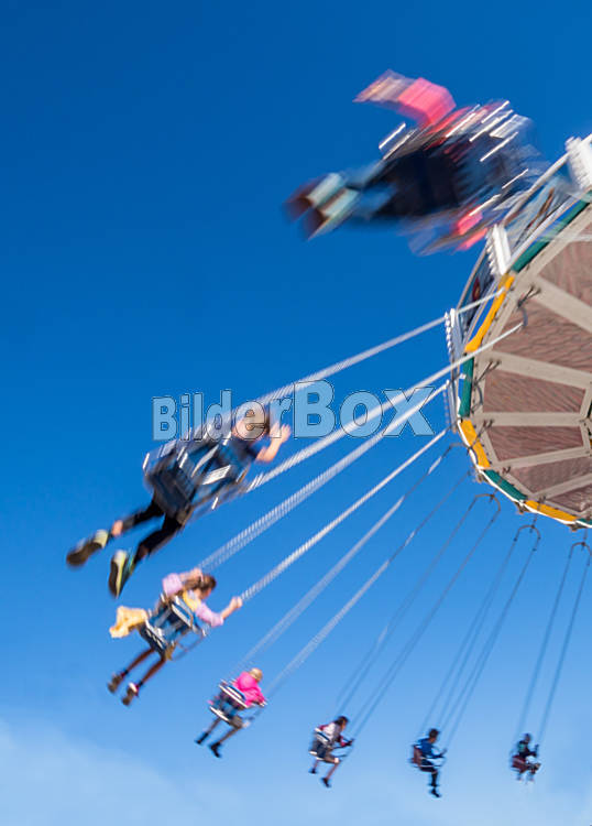 Beschreibung Kinder haben Spaß in einem Ketten Karussell auf einem Kirtag.