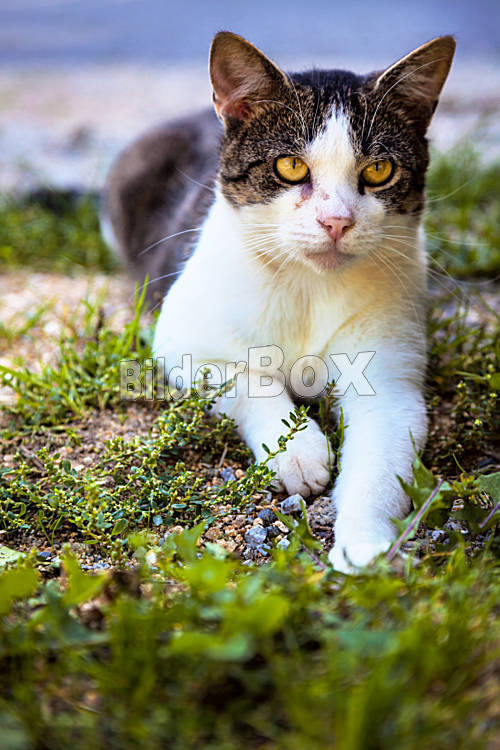Beschreibung Eine gefleckte Hauskatze sitzt am Boden und wartet