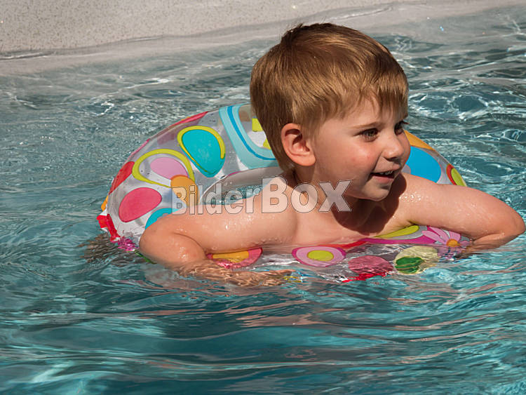 Beschreibung Ein Kind schwimmt mit einem Schwimmreifwn im Pool und kühlt sich an einem heißen Sommertag ab.