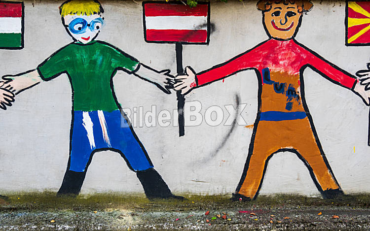 Beschreibung Auf der Wand einer Schule halten gemalte Kinder eine Flagge von Österreich in ihren Händen.