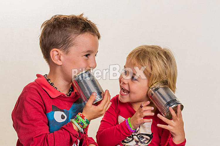 Beschreibung Zwei kleine Kinder telefonieren mit einem Telefon aus zwei Dosen.