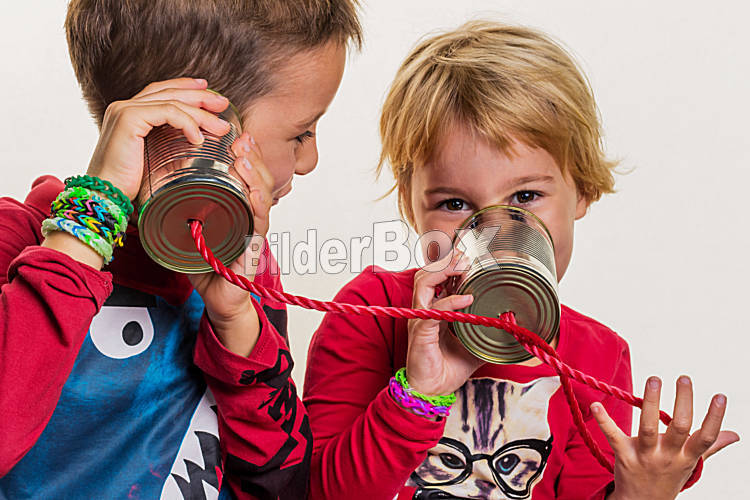 Beschreibung Zwei kleine Kinder telefonieren mit einem Telefon aus zwei Dosen.