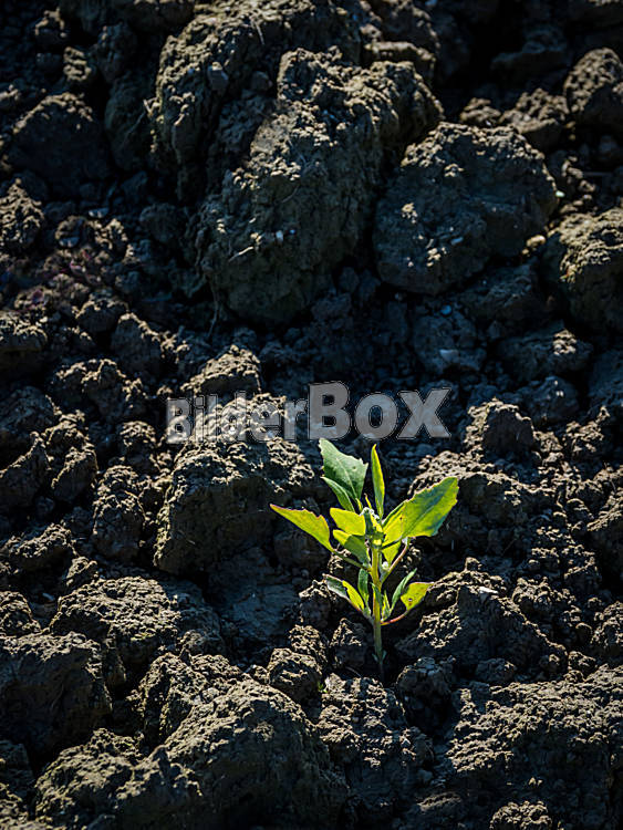 Beschreibung Auf einem Acker wächst eine kleine Pflanze. Symbol für Kraft, Stärke und Wachstum