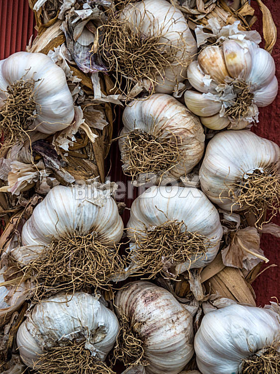 Beschreibung Knoblauch liegt auf einem Gemüsemarkt zum Verkauf