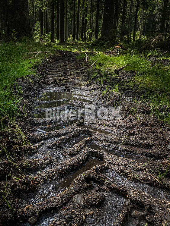Komprimierter Waldboden durch Fahrzeuge. Reifenspuren.