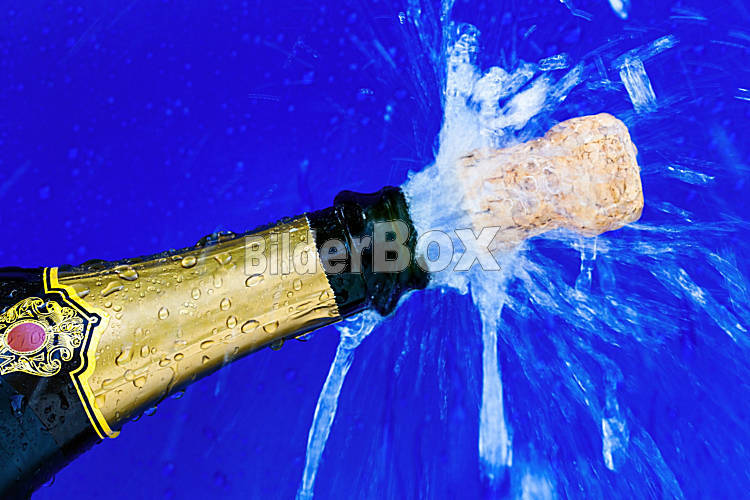 Beschreibung Champagnerflasche wird geöffnet. Korken schießt aus Sektflasche. Symbolfoto für Jahreswechsel, Silvester, Feiern und Eröffnungen.