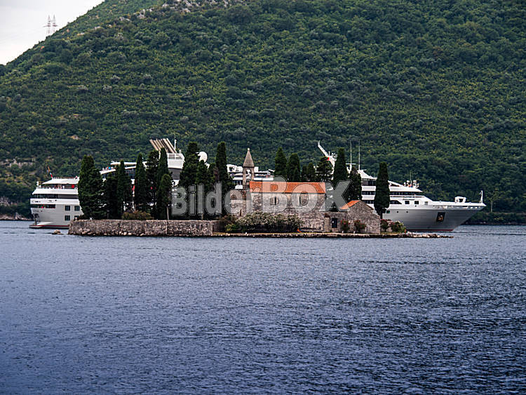 Beschreibung Ein Kreuzfahrtschiff hinter einen kleinen Kirche. In der Nähe von Kotor, Montenegro