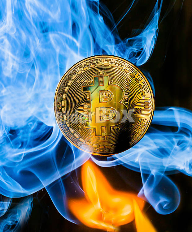 Beschreibung Eine physische Bitcoinmünze im Rauch. Kursprobleme bei digitalen Währungen