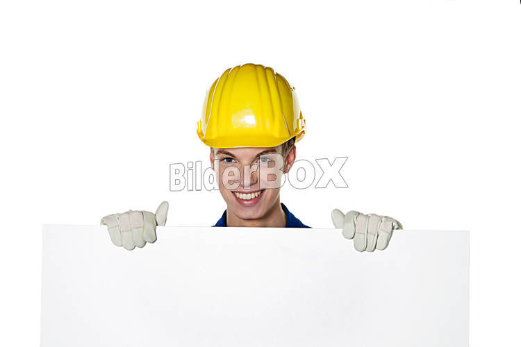 Beschreibung Ein Lehrling / Azubi als Handwerker mit leerer Tafel