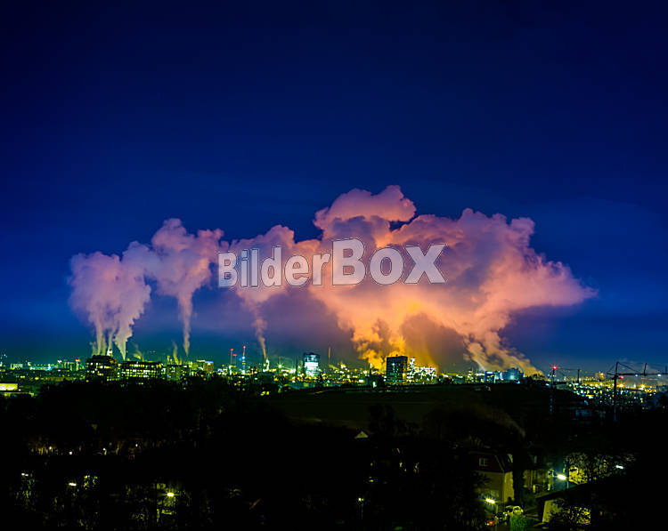 Beschreibung Orange leuchtender Rauch beim Abstechen des Hochofens am Abend in der Voest in Linz.