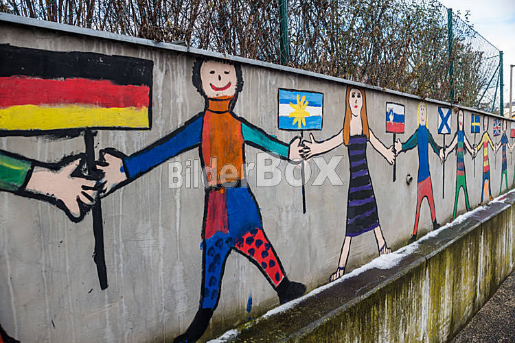 Beschreibung Malerei auf der Mauer einer Schule in Linz Österreich. Schüler aller Nationen die die Schule besuchen mit der Landesflagge