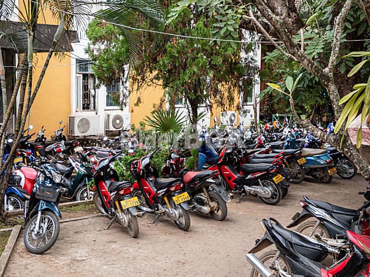 Beschreibung Luang Prabang, Laos - November 20, 2018: Parkplatz für Motorräder. Verkehr in Laos.