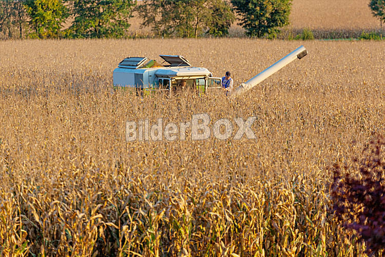 Beschreibung Ein Mähdrescher beim Ernten von Mais auf dem Feld eines Bauern