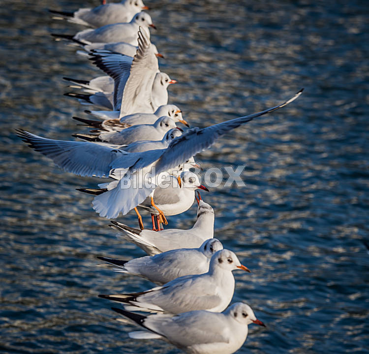 Beschreibung Eine Möwe fliegt zu einem Seil mit vielen anderen Möwen. Symbolfoto für Platznot, Enge und Klaustrophobie
