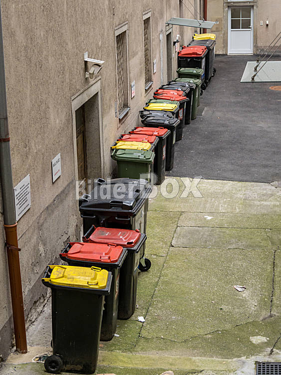 Beschreibung Mülleimer in einem Hinterhof eines Mehrparteienhauses