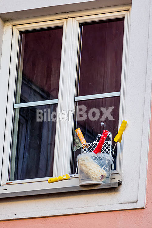 Beschreibung Malerutensilien vor einem Fenster, Symbol für Renovierung, Instandsetzung, Pfusch