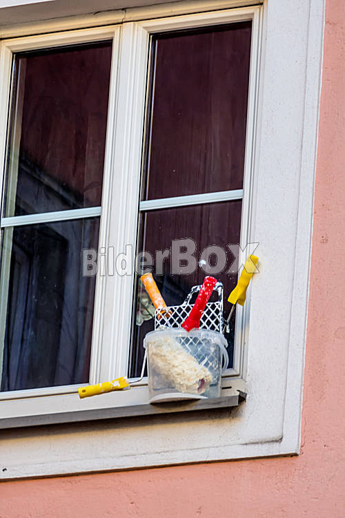 Beschreibung Malerutensilien vor einem Fenster, Symbol für Renovierung, Instandsetzung, Pfusch