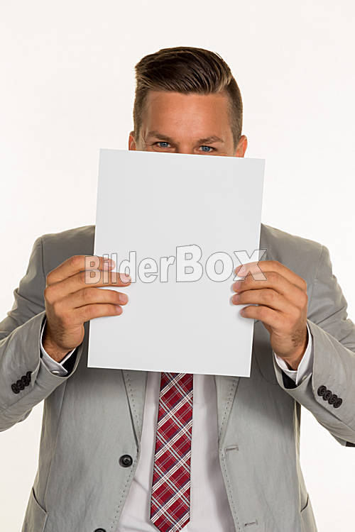 Beschreibung Ein junger UNternehmer hält ein leeres Blatt vors Gesicht.