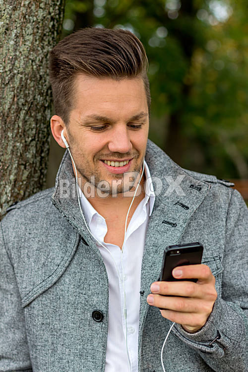 Beschreibung Ein Mann hört Musik mit Ihrem Handy. Unterhaltung am Mobiltelefon.
