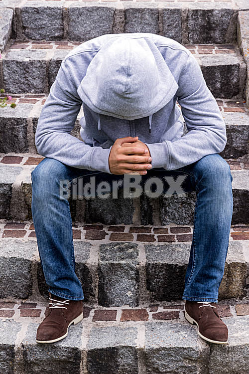 Beschreibung Ein Mann sitzt einsam auf Stufen