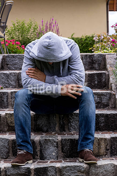 Beschreibung Ein Mann sitzt einsam auf Stufen