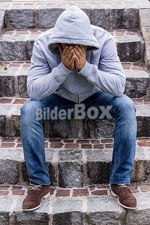Beschreibung Ein Mann sitzt einsam auf Stufen