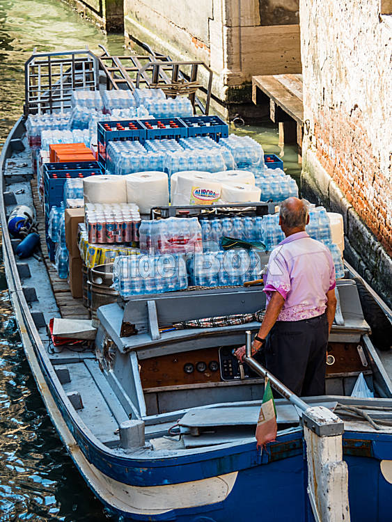 Beschreibung Mineralwasser wird von einem Boot in Venedig geliefert.