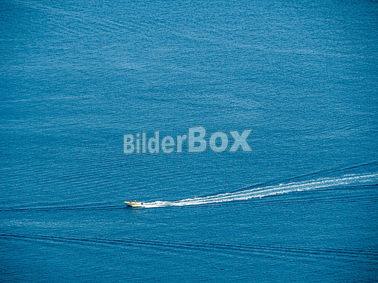 Beschreibung Ein Motorboot schwimmt auf dem Meer.
