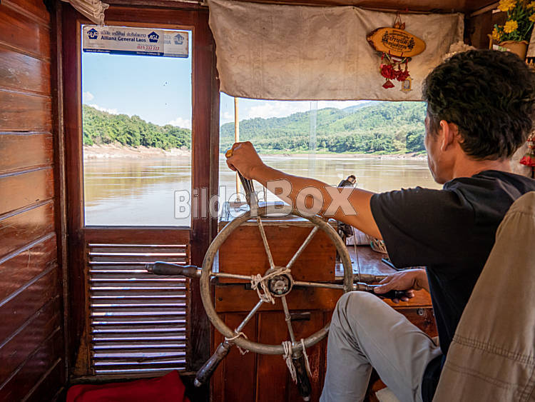 Beschreibung Nähe Ban Boe/Bak Baw, Laos - November 19, 2018: Eine Bootsfahrt am Mekong gehört zu den touristischen Highlights in Laos