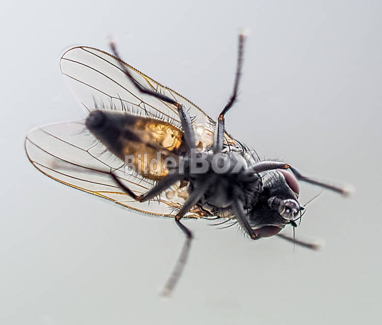 Beschreibung Eine Stubenfliege wurde auf einer Glasscheibe von unten aufgenommen. Makro