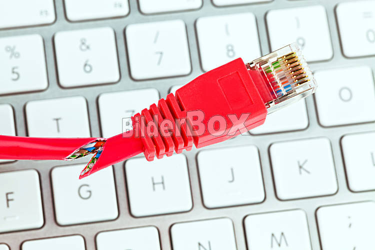 Beschreibung Das rote, defekte Kabel eines Netzwerkes von einem Computer.