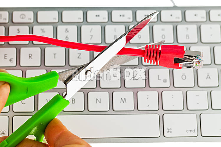 Beschreibung Das rote, defekte Kabel eines Netzwerkes von einem Computer.