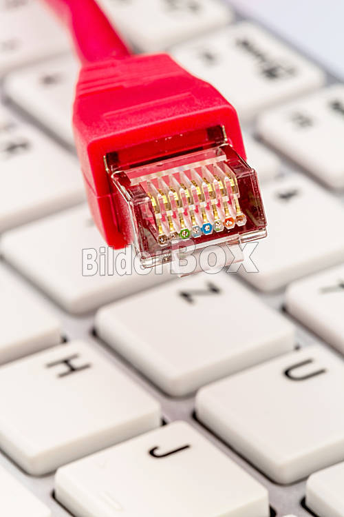 Beschreibung Netzwerkkabel auf Tastatur, Symbolfoto für Flatrate, E-Commerce, globale Kommunikation