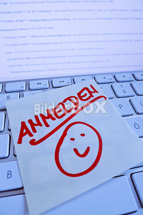 Beschreibung Ein Notizzettel liegt auf der Tastatur eines Computers zur Erinnerung: Anmelden
