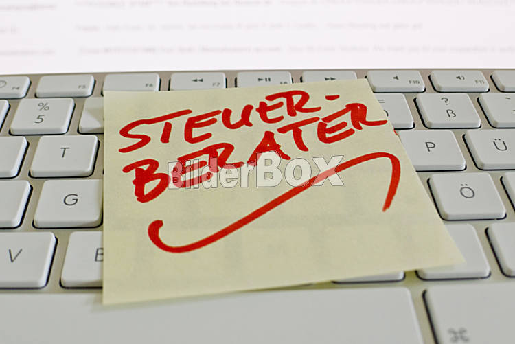Beschreibung Ein Notizzettel liegt auf der Tastatur eines Computers zur Erinnerung: Steuerberater