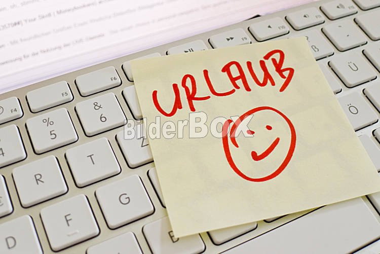 Beschreibung Ein Notizzettel liegt auf der Tastatur eines Computers zur Erinnerung: Urlaub