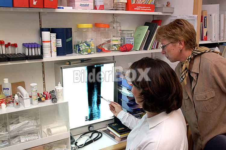 Aerztin mit Roentgenbild einer Wirbelsaeule und Patientin
