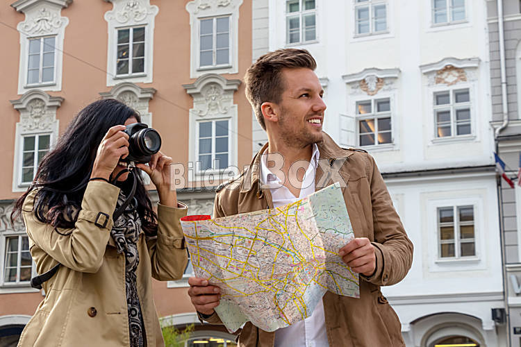 Beschreibung Junges Paar mit Stadtplan und Reiseführer bei der Besichtigung einer Stadt im Urlaub
