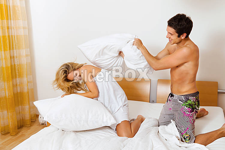 Beschreibung Paar hat Spass im Bett. Lachen, Freude und Erotik im Schlafzimmer