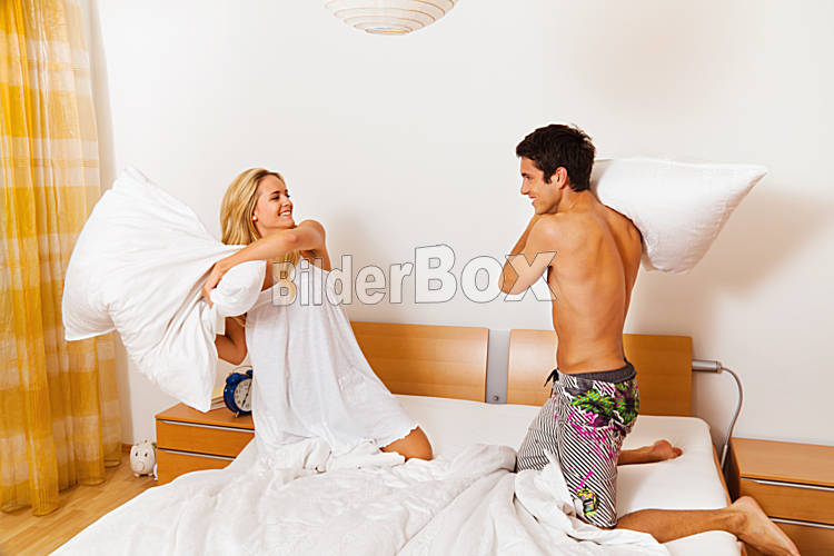 Beschreibung Paar hat Spass im Bett. Lachen, Freude und Erotik im Schlafzimmer