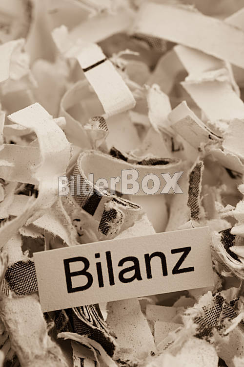 Beschreibung Papierschnitzel mit Stichwort Bilanz, Symbolfoto für Datenvernichtung, Bilanzierung, und ökonomische Analyse