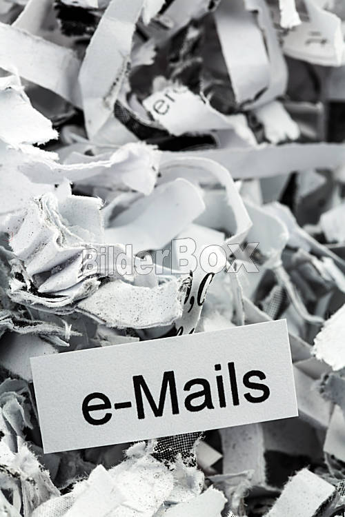 Beschreibung Papierschnitzel mit dem Stichwort e-Mails, Symbolfoto für Datenvernichtung, Mails und Datenüberflutung