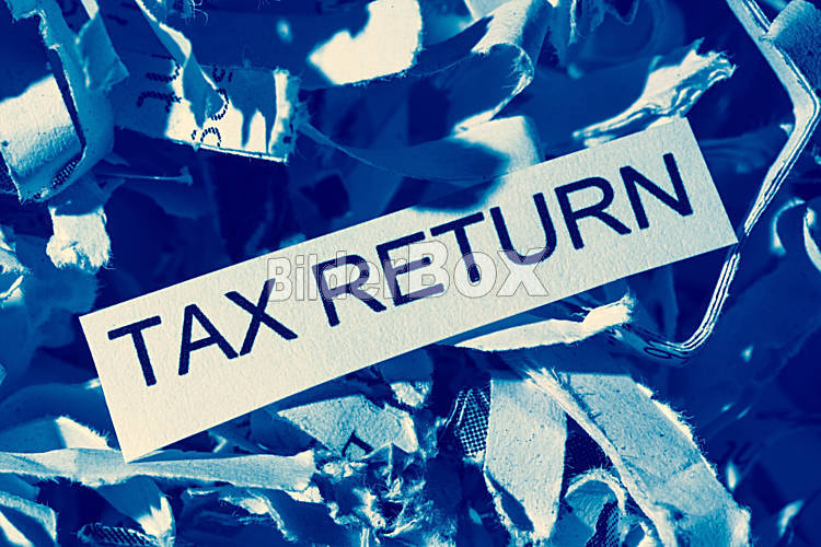 Beschreibung Papierschnitzel mit dem Stichwort Tax Return, Symbolfoto für Datenvernichtung, Datenschutz und Steuerrecht