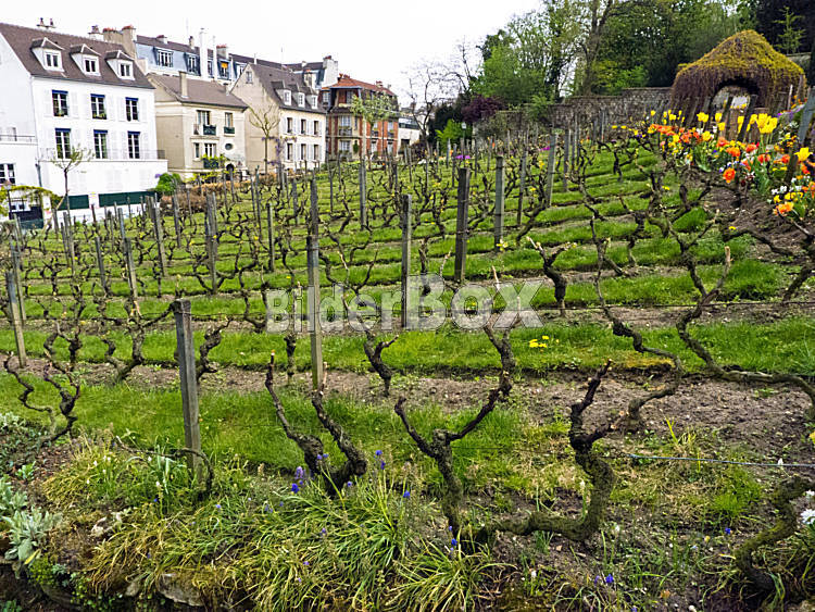 Beschreibung Das Künstlerviertel Montmartre in Paris, Frankreich. Der letzte Weinberg von Paris.